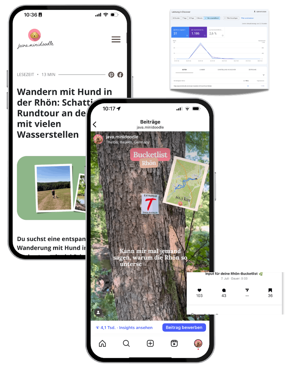 Der zugehörige Blogartikel „Wandern mit Hund in der Rhön: Schattige Rundtour an der Thulba mit vielen Wasserstellen" (Wortanzahl: 862 Wörter) vermittelt konkrete Streckendetails mit Komoot, Fotos, persönliche Einschätzungen zur Machbarkeit mit Hund und echte Empfehlungen aus erster Hand. Gleichzeitig entstand dazu ein stimmiges Instagram-Reel, das die Wanderung visuell erlebbar macht – emotional und informativ zugleich.
