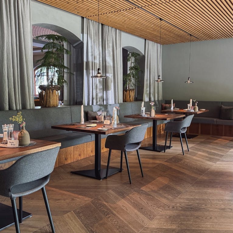 Auch für uns Menschen ist gesorgt: Dreiviertelpension mit Frühstück, Nachmittagsjause und Fünf-Gänge-Menü am Abend, auf Wunsch mit vegetarischen Optionen. Wellness gibt's im kleinen hoteleigenen Spa und im großen Spa-Bereich des Nachbarhotels, den man unkompliziert mitnutzen kann.