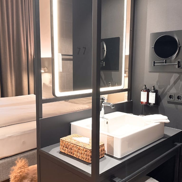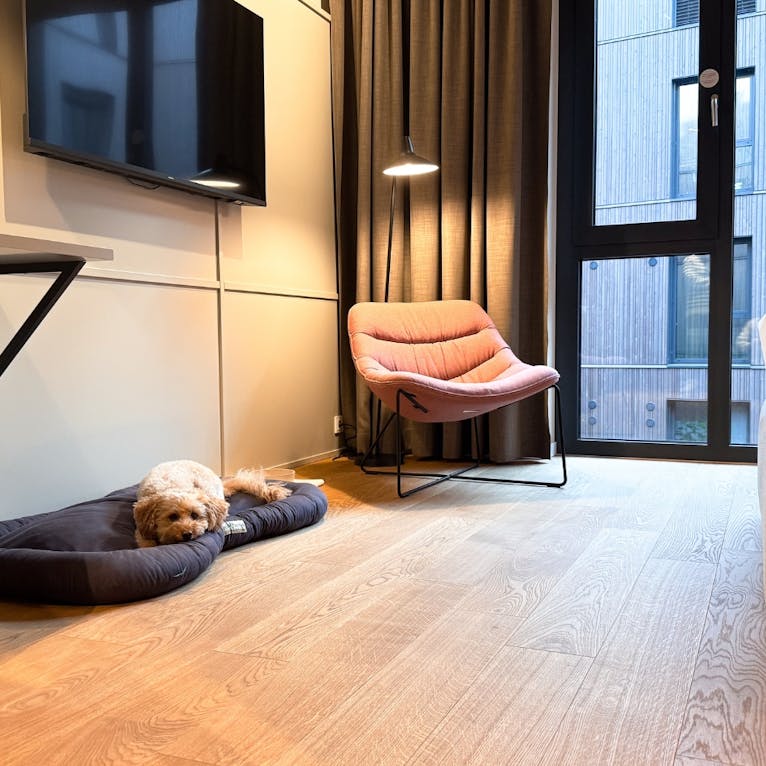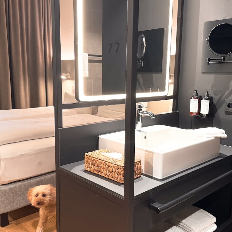 - Ausstattung für Hunde: Im Zimmer warten ein großes Hundebett, zwei Näpfe und Leckerlis. Bitte beachte: Es gibt keinen Kühlschrank auf dem Zimmer. Für Nassfutter oder Frischfutter solltest du entsprechend planen.