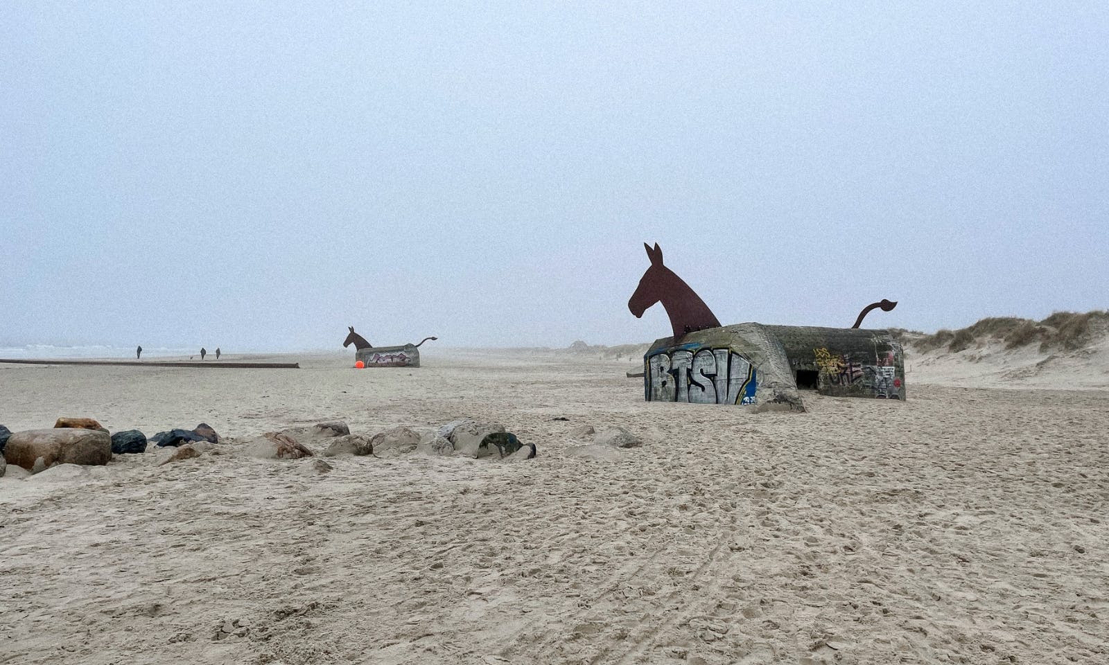 Ein echtes Highlight: die vier Maultierbunker. Ursprünglich Teil des Atlantikwalls, wurden sie später vom Künstler Bill Woodrow in Skulpturen verwandelt. Vier Bunker haben Maultier-Köpfe und „reiten“ je nach Gezeiten auf dem Sand oder den Wellen. Ein beeindruckendes Kunstwerk mit einer starken Botschaft: Der Blick Richtung Meer symbolisiert den Abzug des Krieges und die Hoffnung auf Frieden.