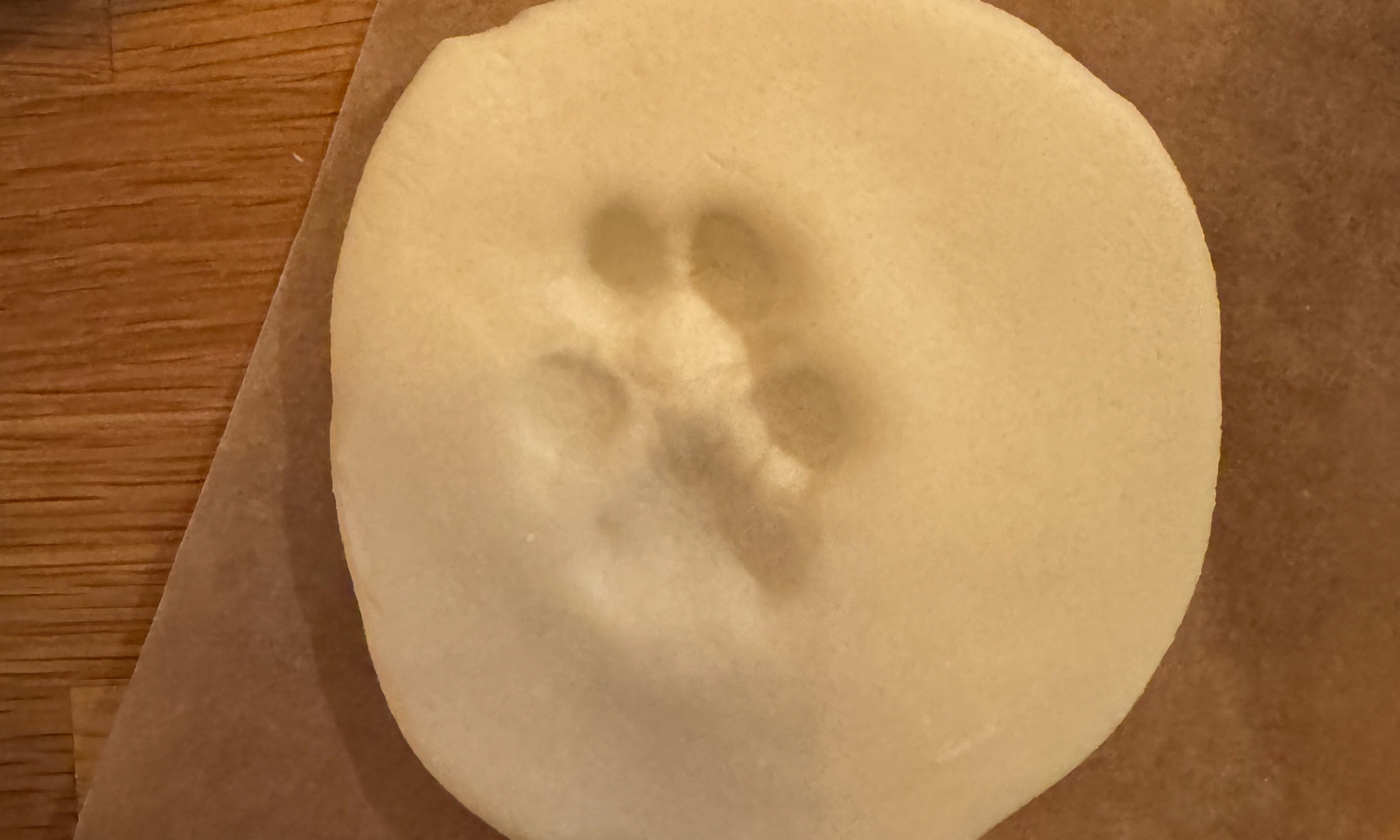 - Die Pfote deines Hundes vorsichtig in den Teig drücken. Wichtig: nicht ablegen lassen, sondern mit sanftem Druck arbeiten. Danach die Pfote abwaschen.