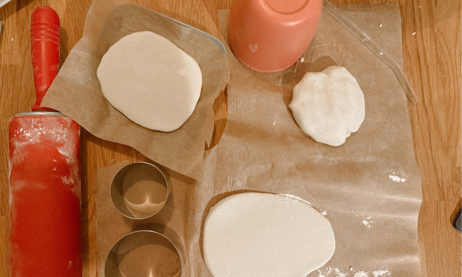 - Den Teig auf einer bemehlten Fläche etwa 1 cm dick ausrollen. Mit einem Glas oder runden Ausstecher passende Kreise oder Anhänger ausstechen.