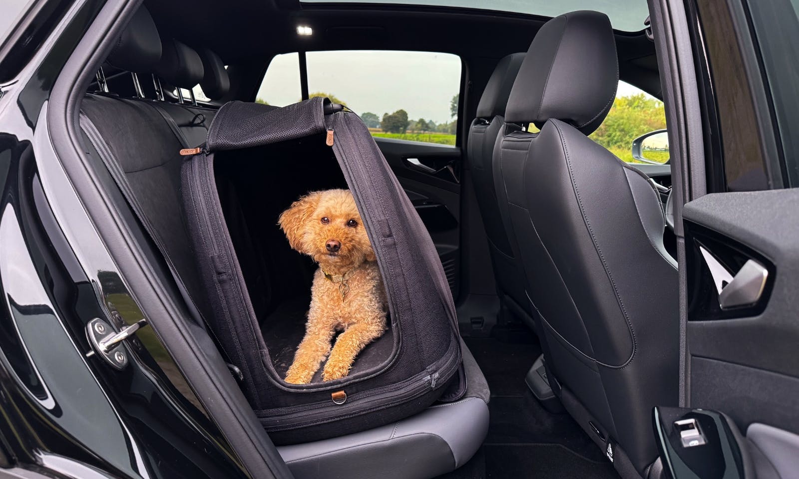 Wir haben die Tavo Crispin in Größe S auf dem Rücksitz unseres VW ID.5 installiert. Java ist etwa 37 Zentimeter hoch und passt damit gut in die Box. Sie kann bequem liegen und sich drehen, hat aber nicht übermäßig viel Spielraum, genau das richtige Maß für sicheres Reisen.