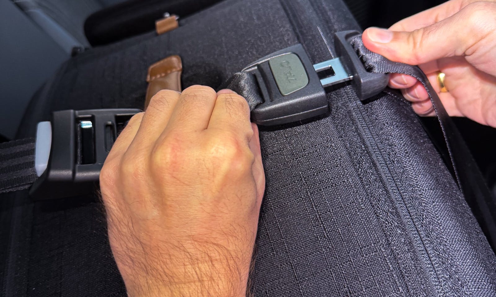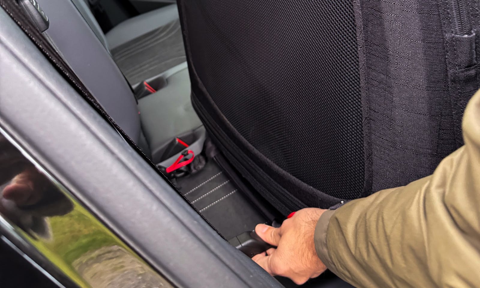 - Gurt befestigen: Den mitgelieferten Gurt (Tether Strap) im Kofferraum an den vorgesehenen Haken anbringen und über die Rückbank legen.