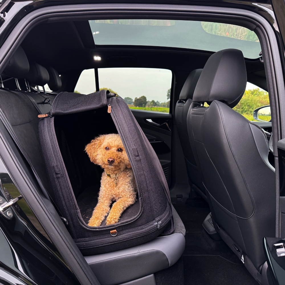 Wir haben die Tavo Crispin in Größe S auf dem Rücksitz unseres VW ID.5 installiert. Java ist etwa 37 Zentimeter hoch und passt damit gut in die Box. Sie kann bequem liegen und sich drehen, hat aber nicht übermäßig viel Spielraum, genau das richtige Maß für sicheres Reisen.