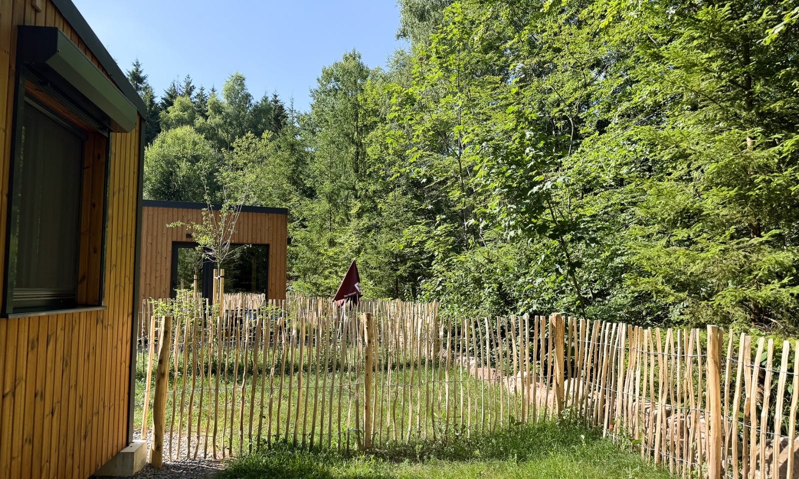Was uns direkt beim Ankommen aufgefallen ist: die Ruhe. Wirklich. Kein Verkehr, kein Lärm, nur Vogelstimmen und das Klopfen vom Specht. Das Tiny House lag direkt am Waldrand und wirkte wie ein kleiner Rückzugsort – abgeschirmt, ohne Einblick, aber trotzdem freundlich und offen.