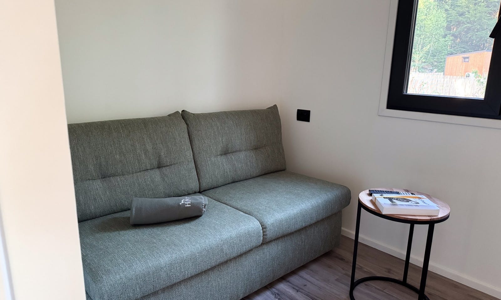 Beim Betreten standen wir zuerst in einem kleinen, offenen Wohn-Essbereich. Die Küche ist voll ausgestattet, inklusive Spülmaschine, Herd und Kühlschrank. Direkt daneben die Lounge mit Schlafsofa, optisch abgetrennt, aber offen genug, dass man trotzdem gemeinsam Zeit verbringt. Im hinteren Teil liegt das separate Schlafzimmer mit gemütlichem Doppelbett. Das Bad ist ist mit Dusche, Waschbecken und WC ausgestattt. Alles war sauber, hochwertig eingerichtet und mit regionalem Holz gestaltet.