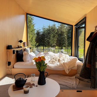 Schon beim ersten Schritt in die Cabin war klar: Hier stimmt einfach alles. Helles Holz trifft auf klare Linien, moderne Designelemente und gemütliche Details. Das Tiny House ist lichtdurchflutet, luftig, liebevoll. Die großen Fenster geben den Blick frei auf die Tannen, und vom Panoramafenster am Bett aus kann man morgens mit der Sonne aufwachen und abends unter den Sternen einschlafen.