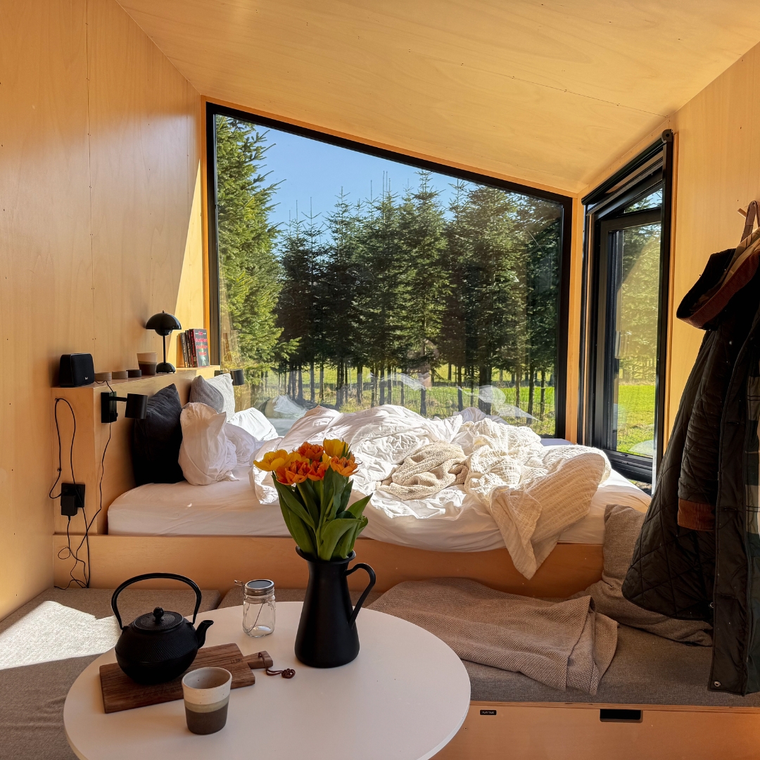 Schon beim ersten Schritt in die Cabin war klar: Hier stimmt einfach alles. Helles Holz trifft auf klare Linien, moderne Designelemente und gemütliche Details. Das Tiny House ist lichtdurchflutet, luftig, liebevoll. Die großen Fenster geben den Blick frei auf die Tannen, und vom Panoramafenster am Bett aus kann man morgens mit der Sonne aufwachen und abends unter den Sternen einschlafen.