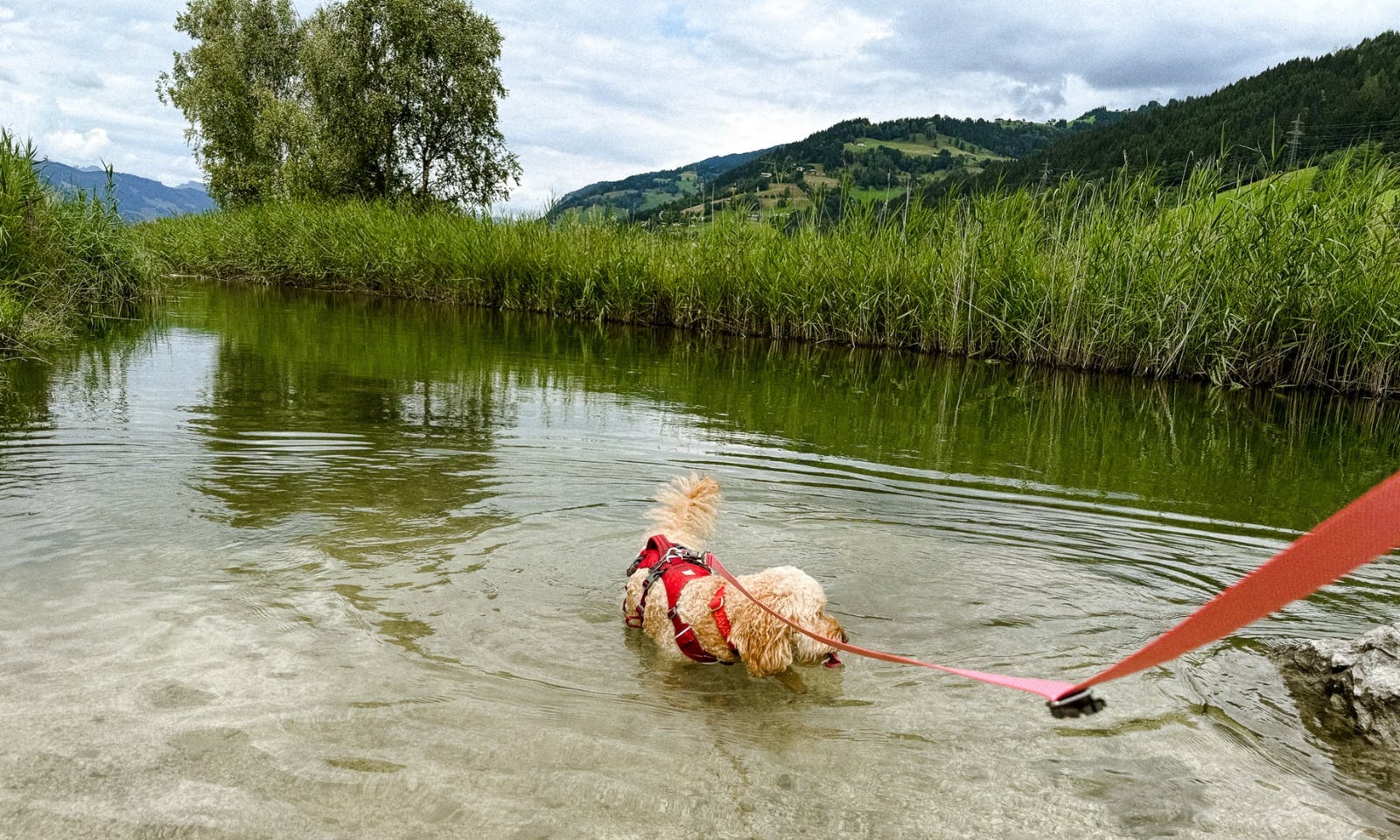 In Österreich müssen Hunde angeleint oder mit Maulkorb ins Wasser. Wir haben einfach eine Leine am Geschirr befestigt und es hat super geklappt.