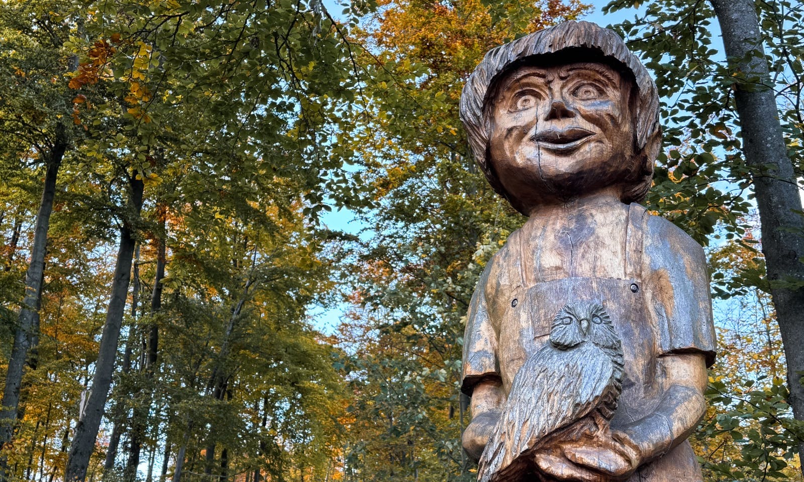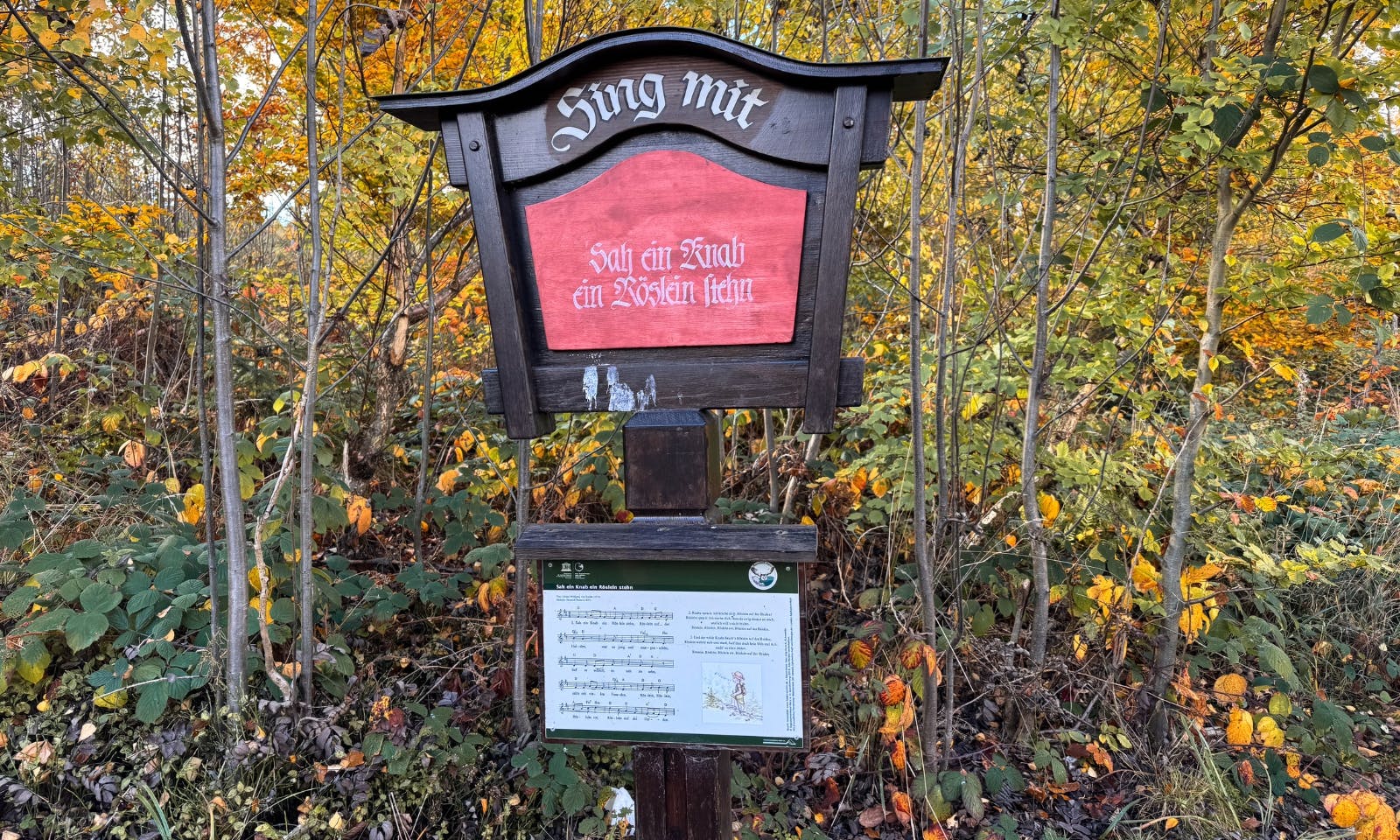 Gleich zu Beginn führt der Weg ein Stück entlang der Straße der Lieder. Hier begleiten dich kleine Tafeln mit bekannten Volksliedern, die anregen, unterwegs vielleicht leise mitzusingen. Zwischen Vogelgezwitscher und Waldesrauschen entsteht so eine ganz eigene Stimmung, charmant, ruhig und ein schöner Auftakt für die kurze, aber aussichtsreiche Tour.