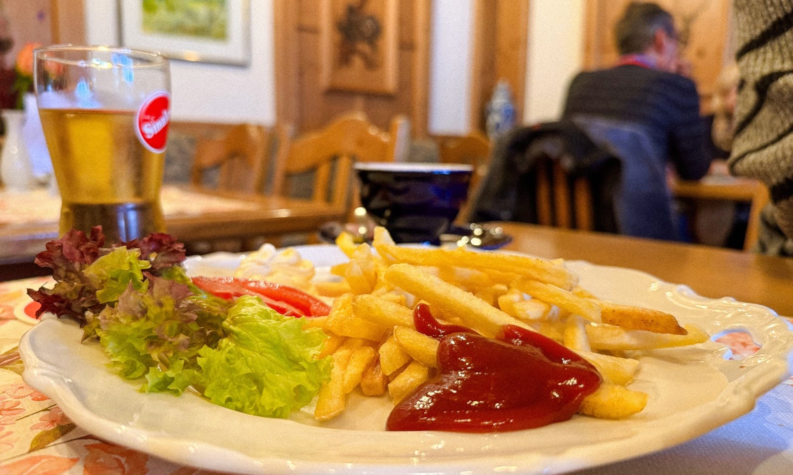 Auf der Karte stehen deftige Gerichte, Kuchen und kleine Snacks. Wir haben uns für eine Portion Pommes und ein Stück Apfelkuchen entschieden: einfach, ehrlich, lecker. Das Preis-Leistungs-Verhältnis passt, und nach dem Aufstieg schmeckt hier sowieso alles doppelt so gut. Perfekt für eine kleine Pause, bevor es gemütlich wieder bergab geht.