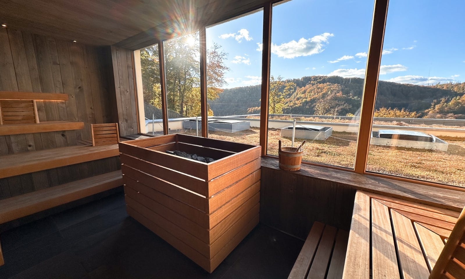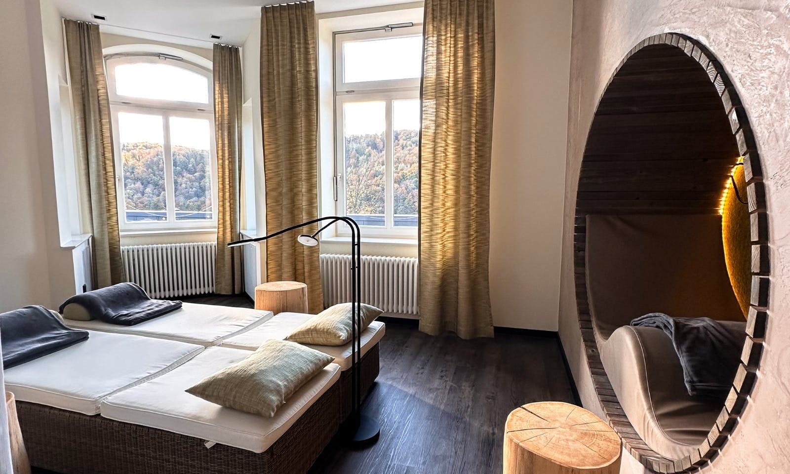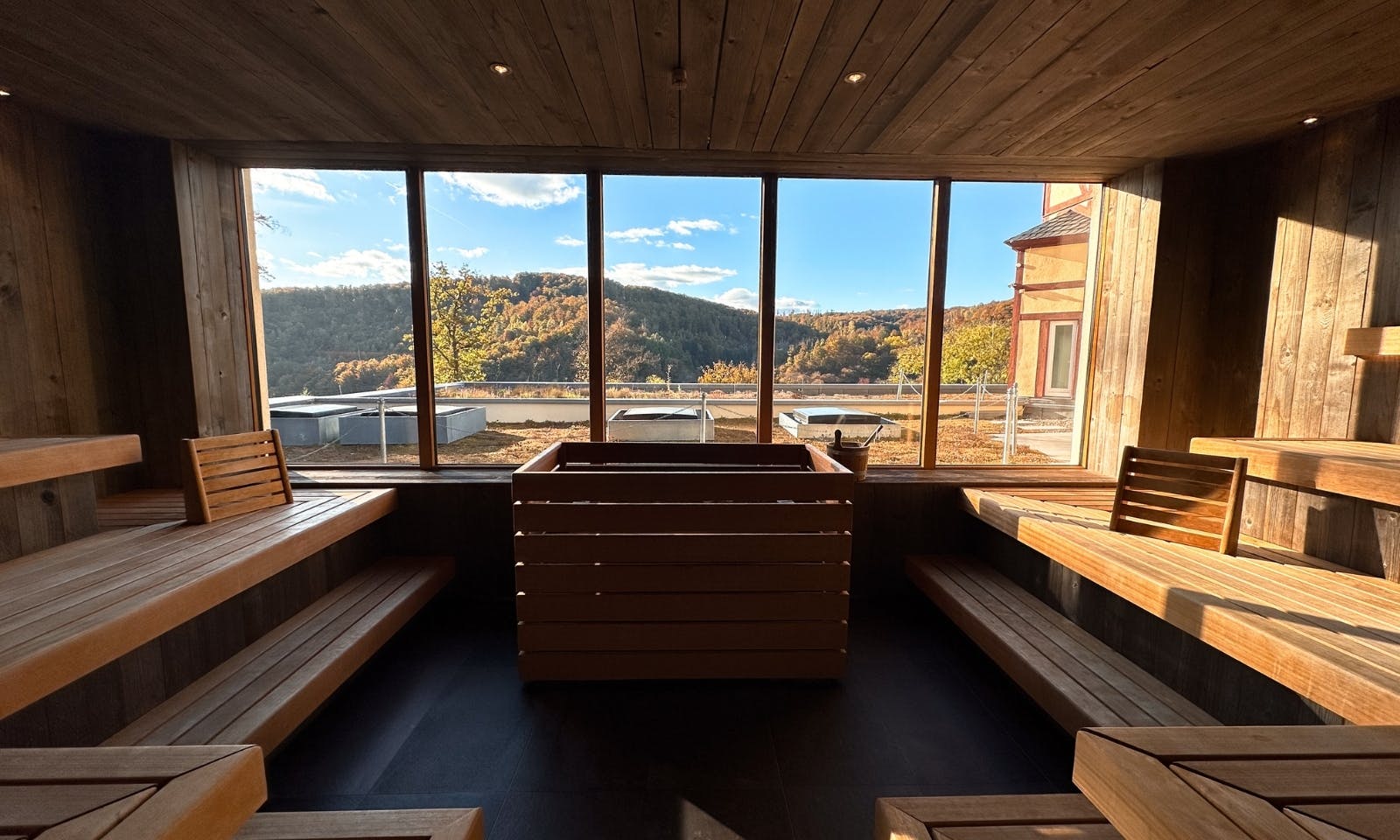 Auch wer kein eigenes Spa-Zimmer hat, kann im FreiWerk entspannen. Im Haupthaus gibt’s einen kleinen, liebevoll gestalteten Wellnessbereich mit Sauna, Ruheraum und großem Panoramafenster über den Harz. Kein Pool, kein Lärm, einfach ein ruhiger Ort zum Runterkommen. Besonders nach einem langen Spaziergang durch die bunten Herbstwälder war das für uns genau richtig. Ein Tee, ein kurzer Saunagang, Stille. Mehr braucht’s oft gar nicht.