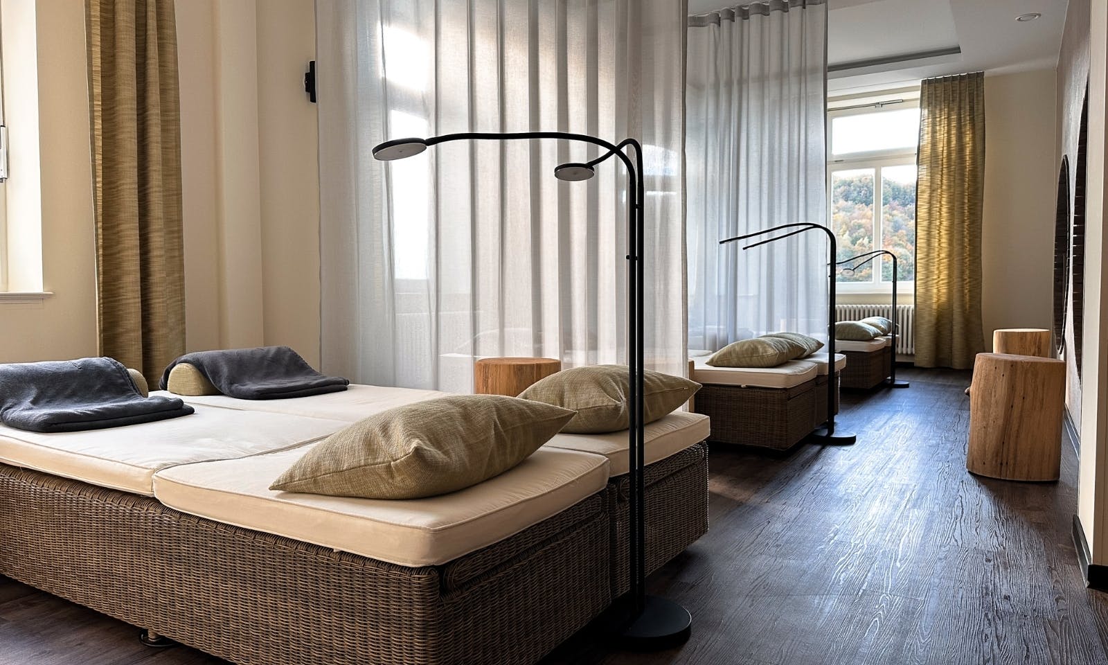 Wer den Blick liebt, sollte sich unbedingt die FreiBlick-Zimmer anschauen. Durch die riesigen Fenster schaut man direkt in die Baumkronen, fast, als würde man draußen schlafen. Innen ist alles hell, klar und gleichzeitig unglaublich wohnlich. Warme Materialien, schöne Stoffe und ein Design, das unaufdringlich, aber edel wirkt. Einige dieser Zimmer sind ebenfalls hundefreundlich, also am besten bei der Buchung gleich mit angeben. Besonders schön: morgens die Vorhänge öffnen und sehen, wie sich das Licht über den Wald legt.