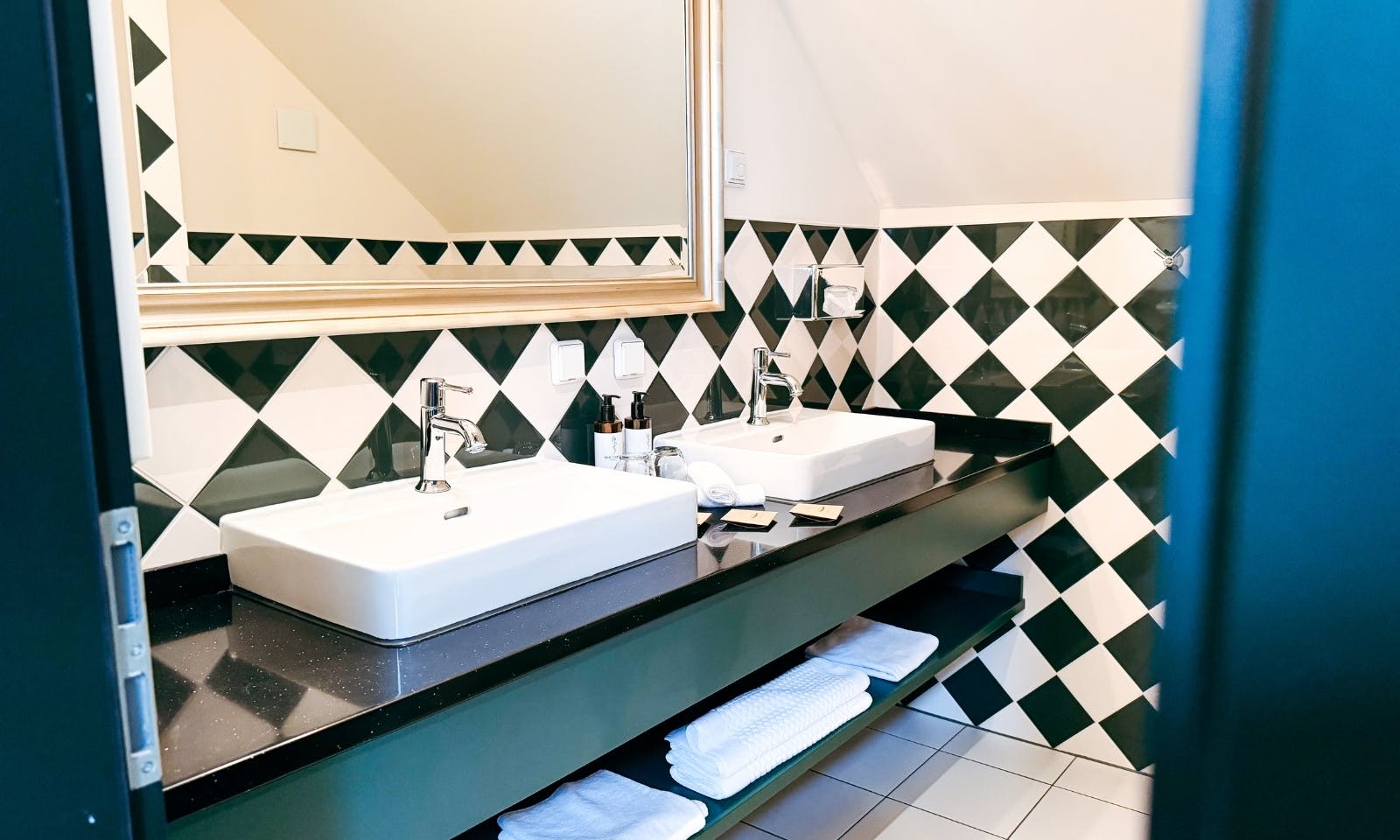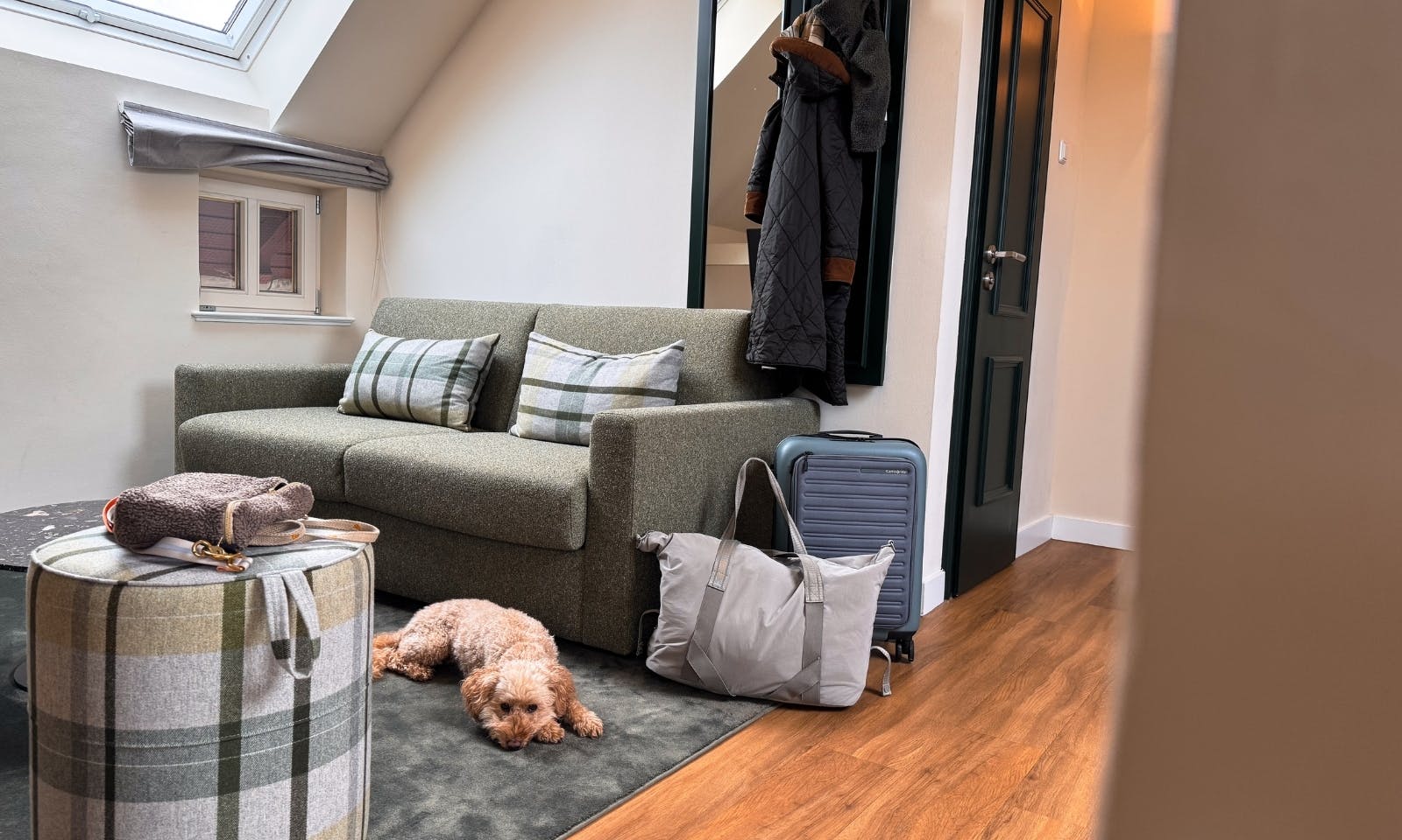 Wir haben im Kutscherhaus gewohnt und uns dort sofort wohlgefühlt. Unsere Familiensuite im Dachgeschoss ist rund 63 m² groß und über eine kleine Holztreppe erreichbar. Oben angekommen, erwartet dich Fachwerk, Holz und ein Hauch britisches Landhausgefühl, grüne Töne, warme Stoffe und ein richtig gemütlicher Wohnbereich. Der ideale Rückzugsort für längere Aufenthalte oder einfach für alle, die es charmant und unaufgeregt mögen. Java hat hier direkt ihren Lieblingsplatz gefunden.