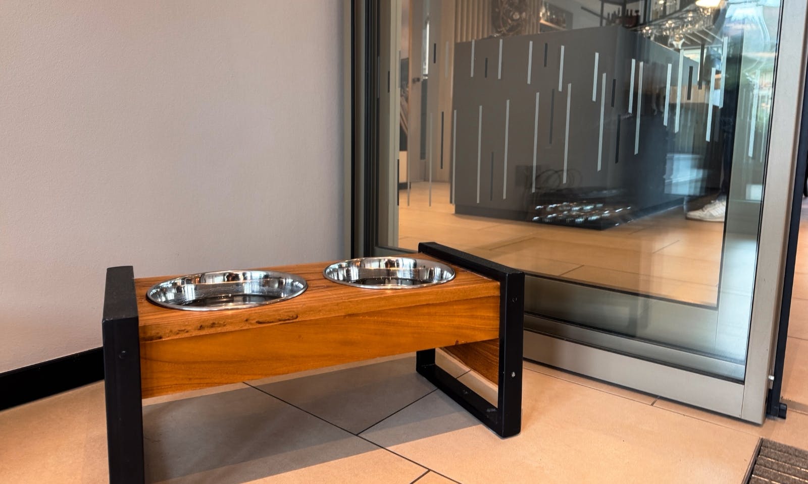 Mit Hund ist das Thema Essen im FreiWerk geregelt. Im Restaurant selbst dürfen Hunde nicht mit rein, was wir völlig nachvollziehbar finden. Dafür gibt es in der Lobby einen Hochtisch, an dem man wunderbar frühstücken oder auch abends Essen oder einfach ein Glas Wein trinken kann. Der Hund bekommt dort direkt einen Napf mit Wasser, und wenn man eine Decke dabei hat, kommt dein Hund gut zur Ruhe. Wir fanden das einen richtig guten Kompromiss, man ist mittendrin, ohne dass es für andere Gäste stressig wird.