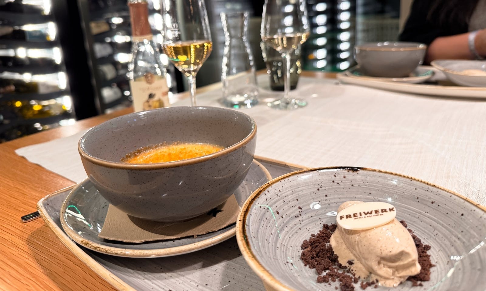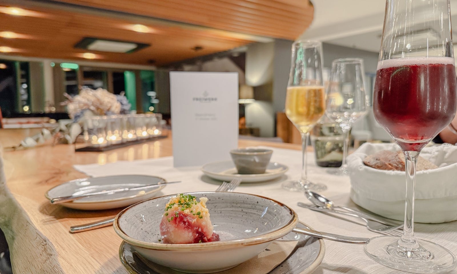 Essen ist im FreiWerk ein bisschen wie der ganze Aufenthalt: ruhig, hochwertig und liebevoll durchdacht, ohne dass es steif wirkt. Gegessen wird im Restaurant 20zwanzig im Haupthaus, wo moderne Küche auf regionale Zutaten trifft. Morgens startet der Tag mit einem wirklich schönen Frühstücksbuffet: frisches Brot, regionale Käse- und Wurstsorten, Obst, Müsli und kleine warme Gerichte. Besonders nett fanden wir die vielen hausgemachten Köstlichkeiten, vom Aufstrich bis zum Gebäck und die große Auswahl an veganen Produkten.