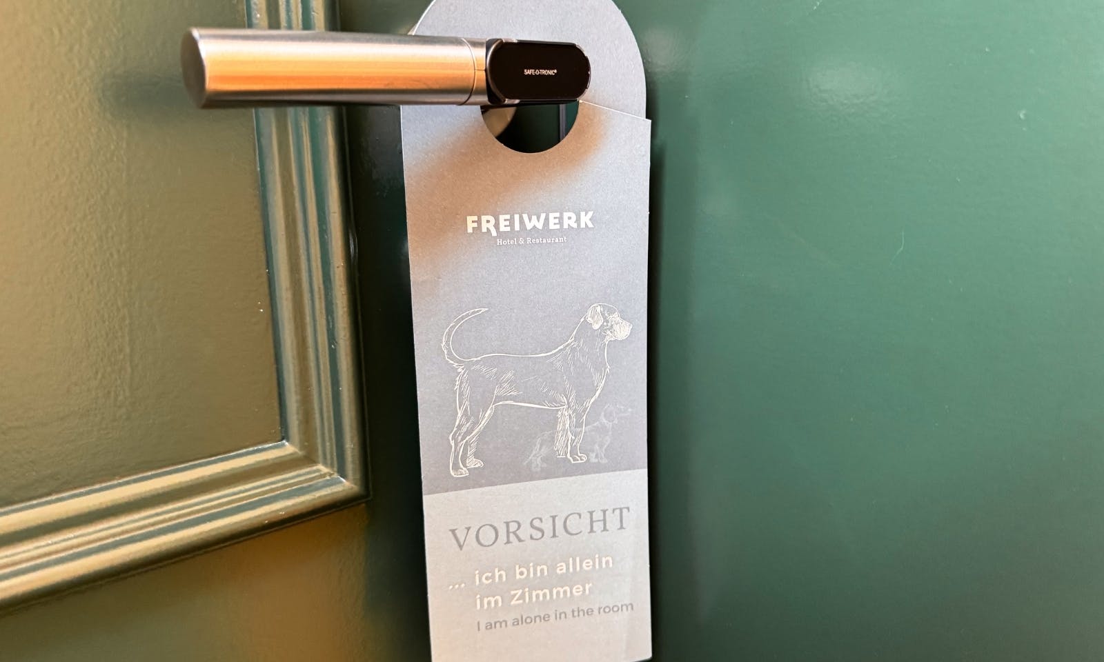 Was wir total wertschätzen: Es gibt im Zimmer ein kleines Schild mit der Info, dass ein Hund mitreist. Klingt unscheinbar, ist aber richtig gut, weil das bedeutet, dass kein Teammitglied einfach so das Zimmer betritt. Gerade, wenn man den Hund mal kurz allein lässt, ist das ein schönes Sicherheitsgefühl.