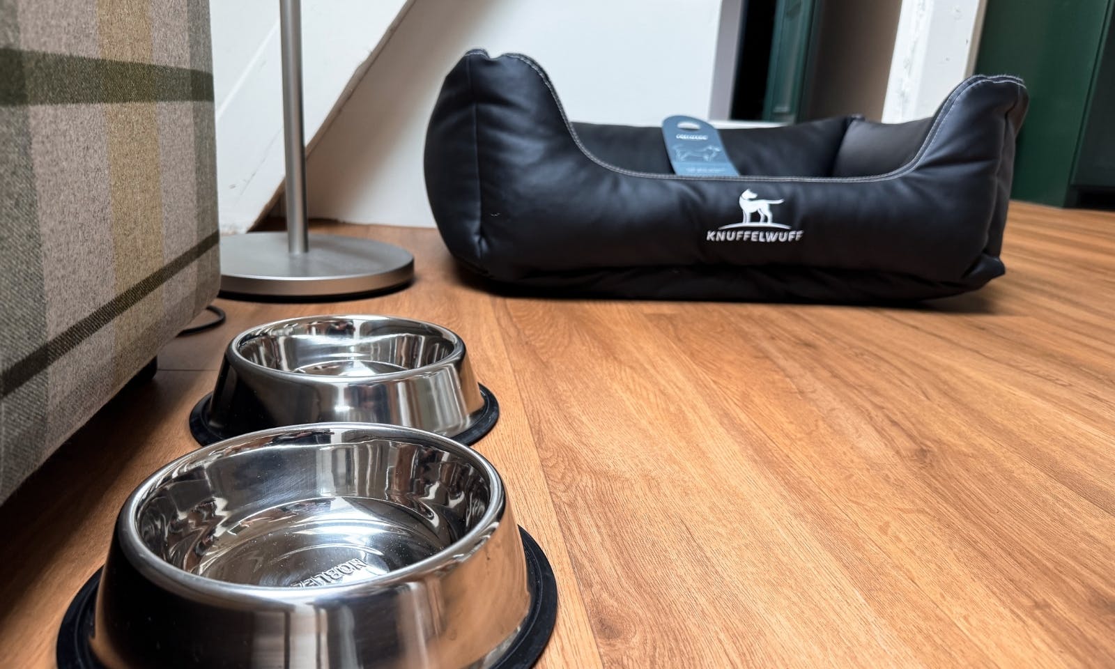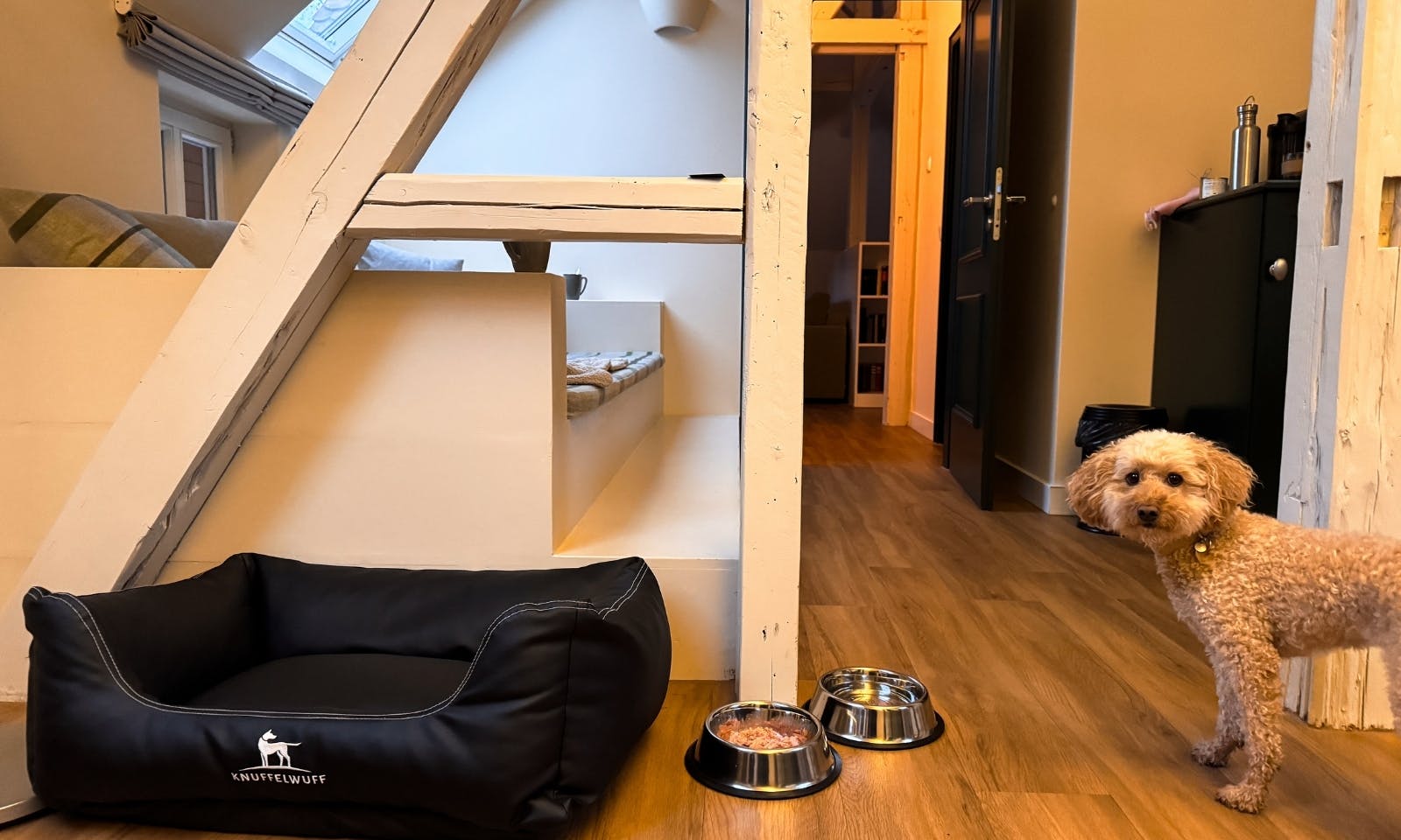 +2 Näpfe sowie ein gemütliches Hundebett stehen im Zimmer zur Verfügung.