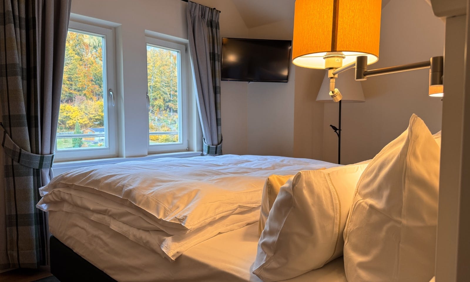 Auch praktisch: Du musst nur den kleinen Hügel hinab und schon bist du auf endlosen Wanderwegen. Perfekt für die erste Gassi-Runde am Morgen oder einen kurzen Spaziergang nach dem Abendessen. Im Herbst ist das besonders schön, weil die Laubbäume rund ums Hotel in allen Farben leuchten.