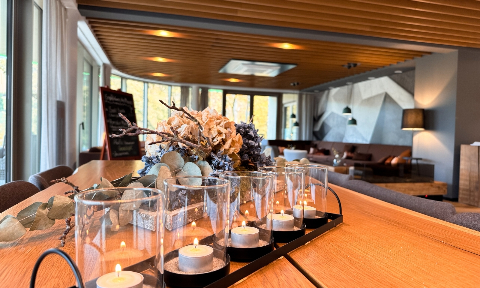 Auch wer kein eigenes Spa-Zimmer hat, kann im FreiWerk entspannen. Im Haupthaus gibt’s einen kleinen, liebevoll gestalteten Wellnessbereich mit Sauna, Ruheraum und großem Panoramafenster über den Harz. Kein Pool, kein Lärm, einfach ein ruhiger Ort zum Runterkommen. Besonders nach einem langen Spaziergang durch die bunten Herbstwälder war das für uns genau richtig. Ein Tee, ein kurzer Saunagang, Stille. Mehr braucht’s oft gar nicht.