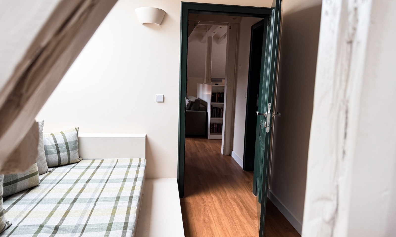 Wir haben im Kutscherhaus gewohnt und uns dort sofort wohlgefühlt. Unsere Familiensuite im Dachgeschoss ist rund 63 m² groß und über eine kleine Holztreppe erreichbar. Oben angekommen, erwartet dich Fachwerk, Holz und ein Hauch britisches Landhausgefühl, grüne Töne, warme Stoffe und ein richtig gemütlicher Wohnbereich. Der ideale Rückzugsort für längere Aufenthalte oder einfach für alle, die es charmant und unaufgeregt mögen. Java hat hier direkt ihren Lieblingsplatz gefunden.